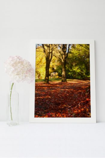 Sous-bois en automne après la pluie, photographie haute résolution d’une forêt. L’image met en valeur de jeunes arbres parsemés de gouttes d’eau ; un paysage de nature aux couleurs chaudes et automnales.